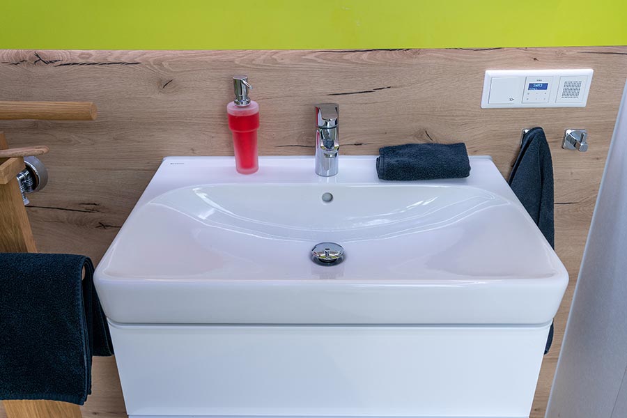 Wir sind Ihr kompetenter Badprofi an Ihrer Seite. Für wohnliche Behaglichkeit im mobilen Badanhänger sorgen beispielsweise Bodenfliesen in naturgetreuer Holzoptik. Ebenso trägt das zeitlos elegante und moderne Mobiliar seinen Teil dazu bei – qualitativ hochwertig, praktisch und bequem.